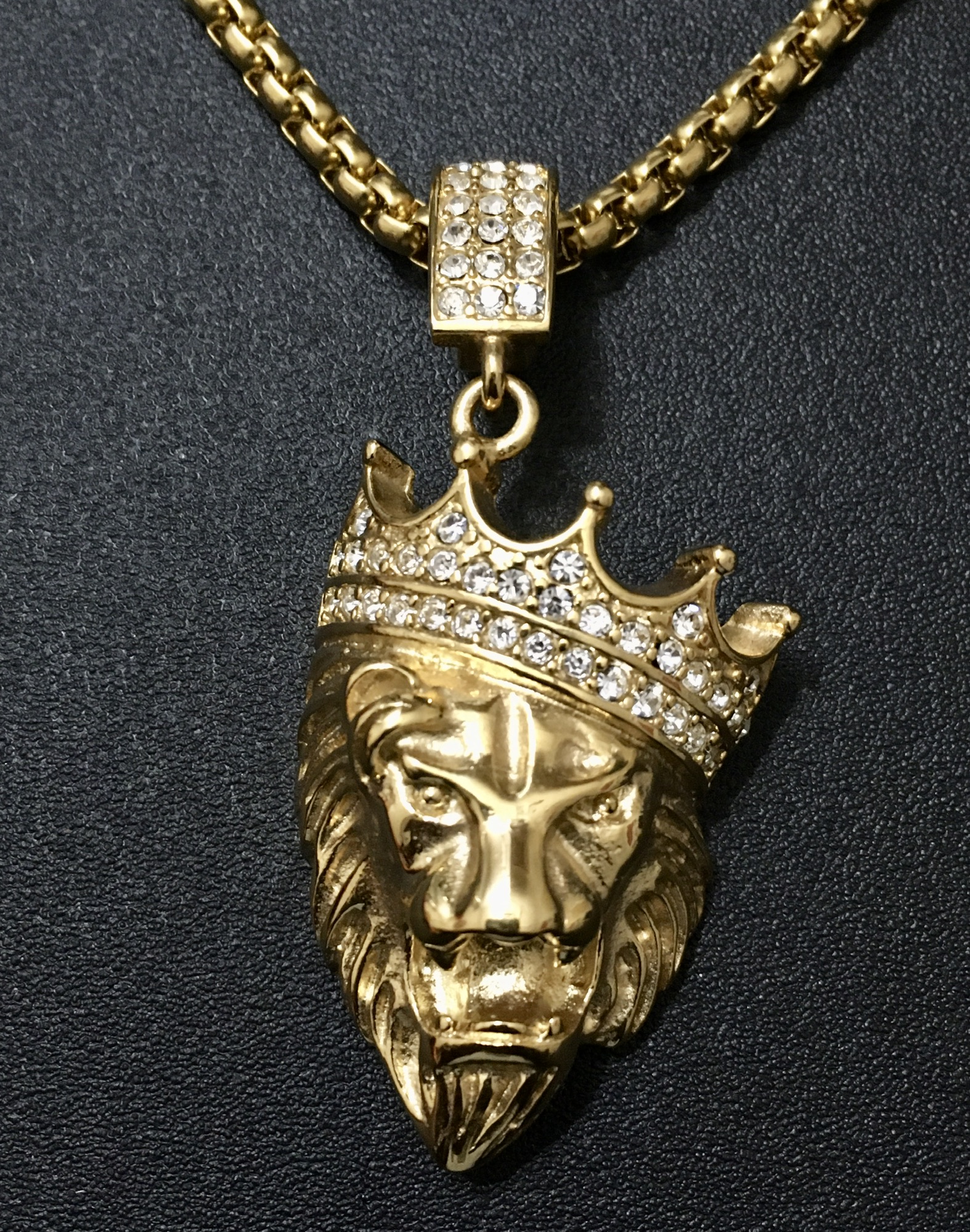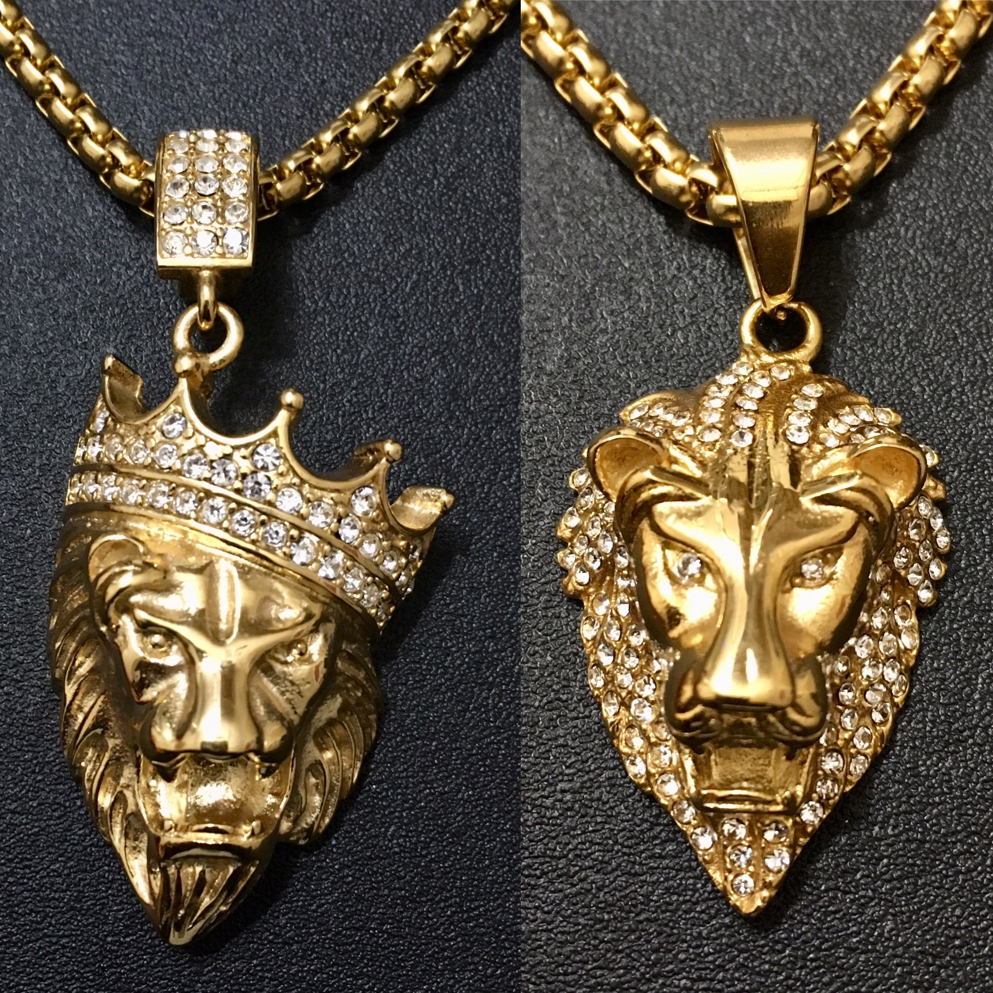 Iced OUT or CROWNED Stainless Steel Lion Head 35mm x 20mm come on a 22 inch Stainless Steel Rolo Cable Wheat Chain, Lead & Nickel free.