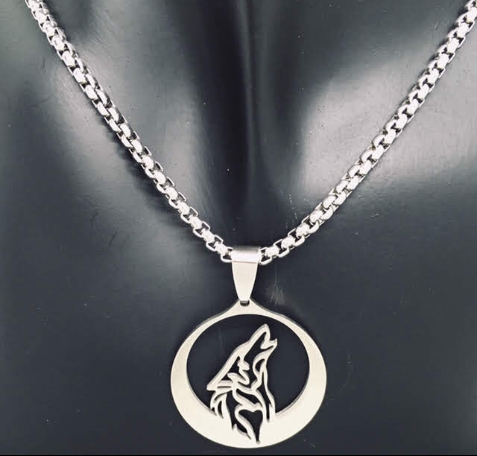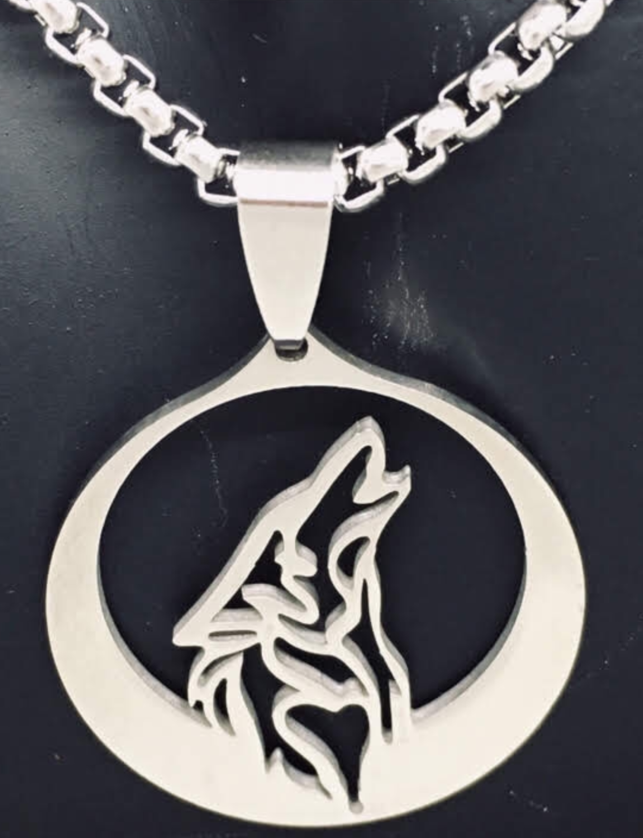1in x 1in Stainless Steel Howling Wolf Charm necklace, on a 23in Stainless Steel Rolo Cable Wheat chain, nickel and lead free.
