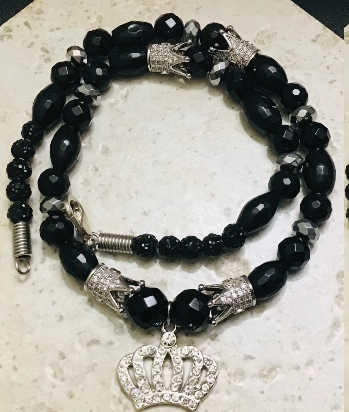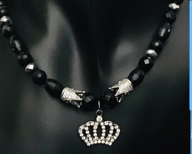 HANDCRAFTED!! NON TARNISH CROWN PENDANT 3/4 inch wide, embedded with 40;2mm Cubic Zirconias BLING BLING!! PLUS 4 MICRO PAVED CUBIC ZIRCONIA CROWNS, BRILLIANT LUSTER!! Made with BLACK ONYX Gemstones (STRENGTH)! Silver Hematite embellished, Choker is 17 inches long. With lobster clasp.