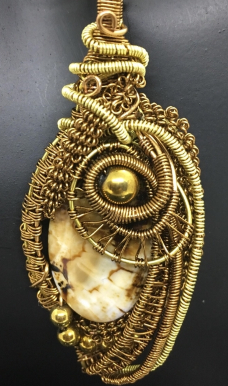 Fit for a Queen! Handmade Wrapped Brown Agate 25mm x 12mm Weaved in Brass/Antique Brass with 6 Gold Hematite Rounds. Pendant 1 1/2in x 1in, comes with a complimentary 18 Brass chain. Tarnish Resistant Gold is 99% copper filled covered by sheets of gold in a mechanical bonding process. Tarnish Resistant Gold does not flake off, rub off or turn colors. You can wear it without worry of allergic reaction it is Lead & Nickel free. All Gemstones are natural & ethically sourced.