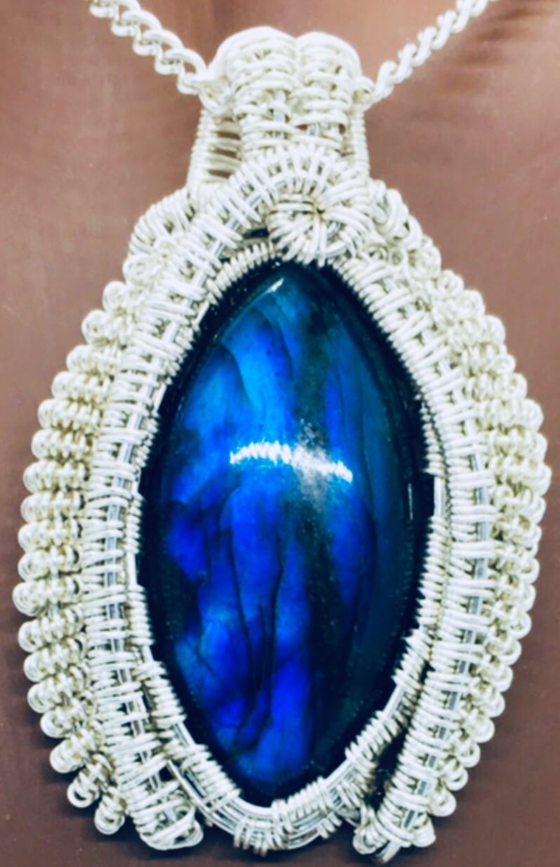 STUNNING!!! HANDMADE Coiled Blue Labradorite Cabochon 35 x 18 x 5mm, Wire Wrapped & Weaved with Sterling Silver, Pendant 1 3/4 x 1 1/4in, on a Complimentary Silver Plated 18in Chain, All Gemstones are natural & ethically sourced.