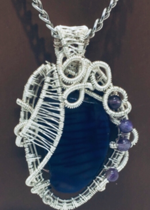 Handmade STUNNING Silver Wrapped and Weaved Oval-ish Purple Agate Gemstone w/tiny 4mm Amethyst beads. 2 inch x 1 inch on a Complimentary silver plated 18 inch necklace, Lead & Nickel free, All Gemstones are natural & ethically sourced.