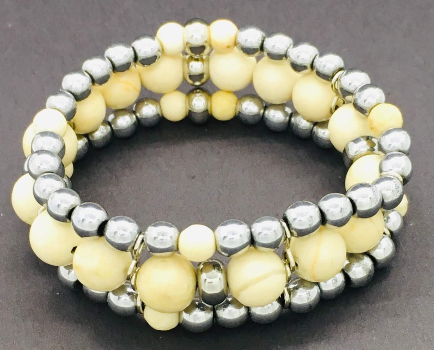 10mm & 6mm Cream Fossil Jasper Gemstones, 8mm & 6mm Silver Hematite Gemstones, 3 Layers 1 Bracelet. Heavy duty, Strong, Stretchy, Resilient, & Flexible, Lead & Nickel free, All Gemstones are natural & ethically sourced.