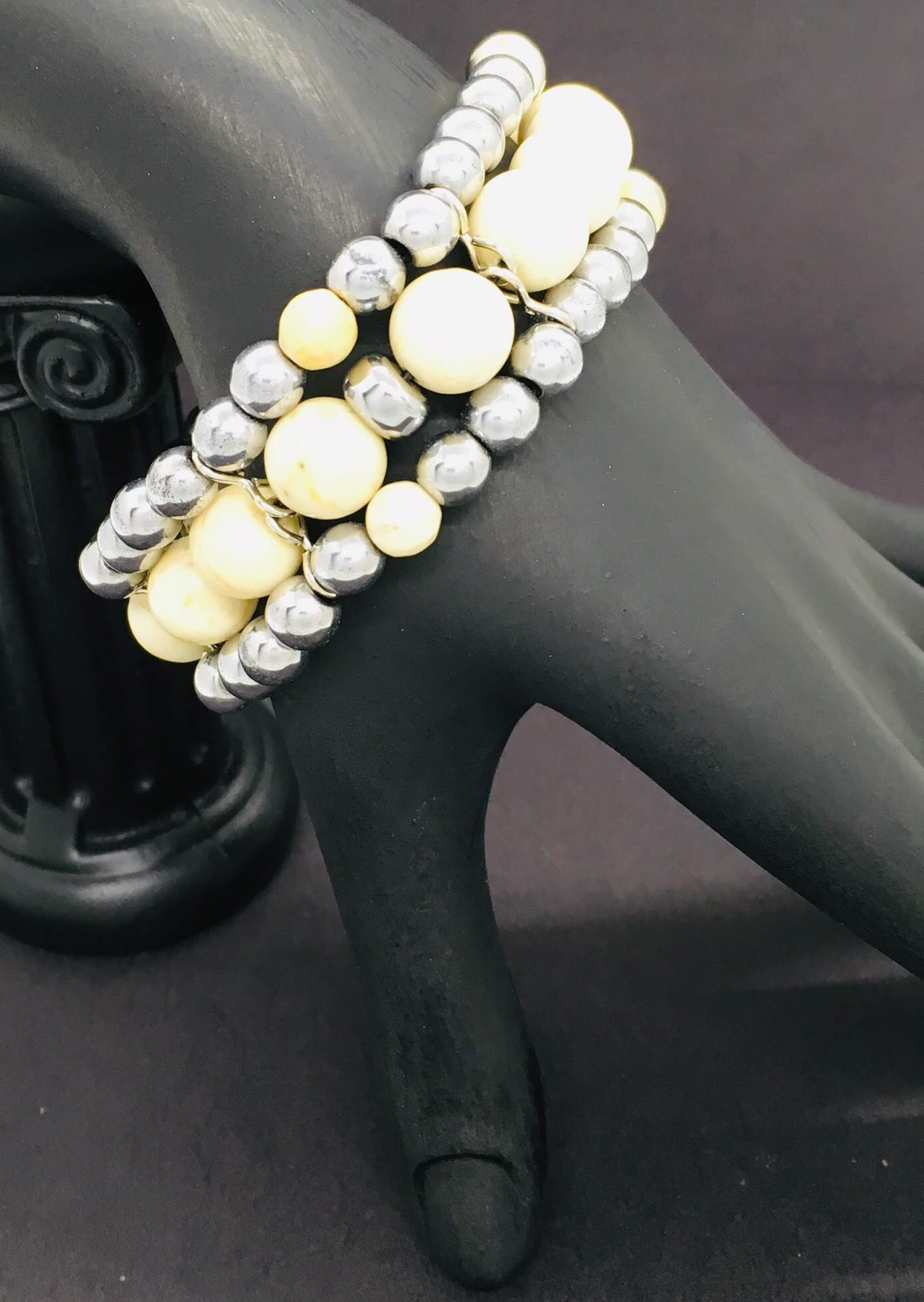 Cream Fossil Jasper, Silver Hematite 3x Bracelet