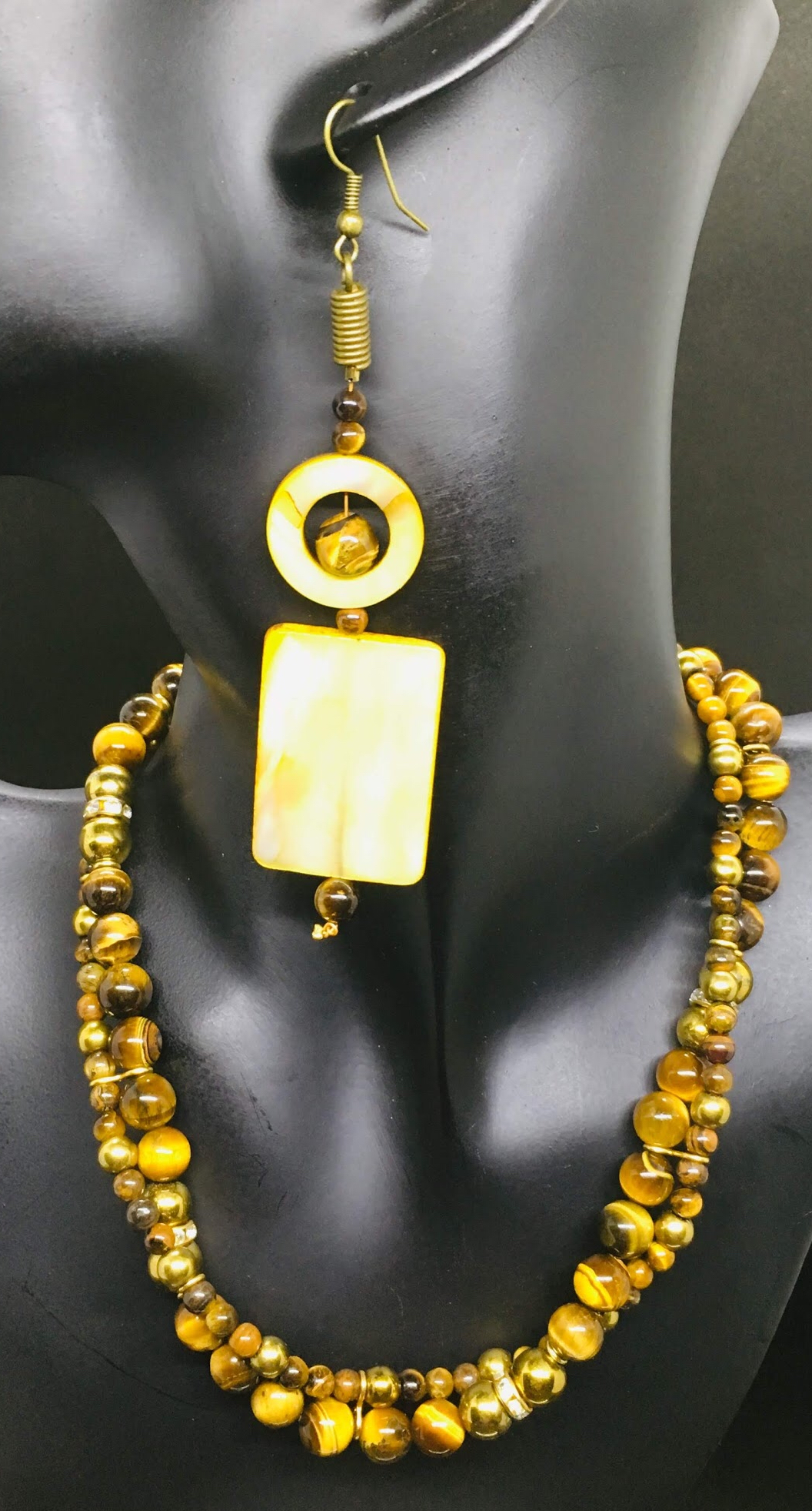 2mm, 6mm & 8mm Tiger Eye Gemstones, 1 1/4in x 3/4in Rectangle Shells, 1/2in x 1⁄2in donut shells. Earrings 3 1/2in long, Lead & Nickel free, All Gemstones are natural & ethically sourced.