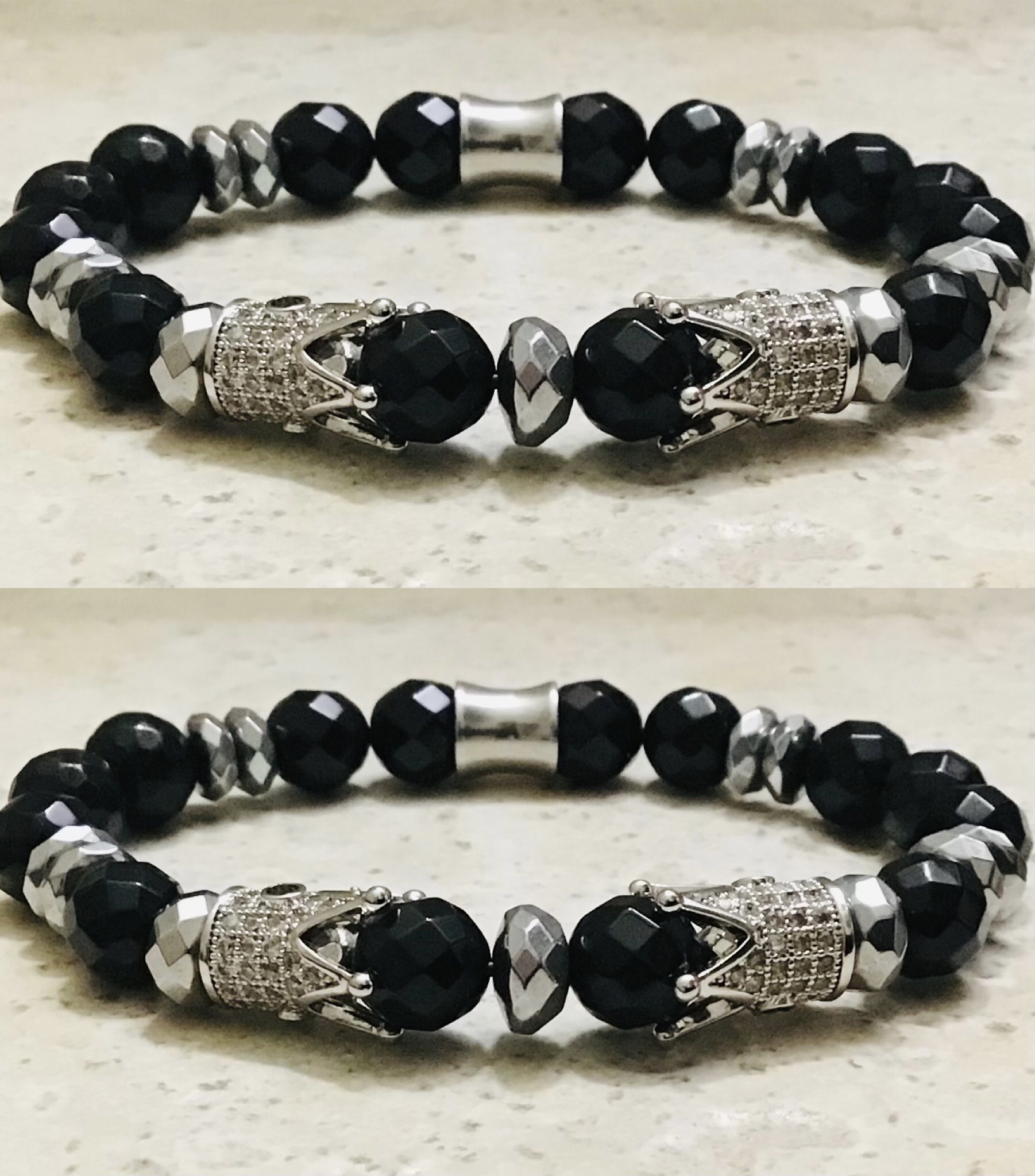 8mm Faceted Black Onyx Gemstones embellished with Silver Hematite with 2 micro paved cubic zirconia crowns Heavy duty, Strong, Stretchy, Resilient, & Flexible, Lead & Nickel free, All Gemstones are natural & ethically sourced.