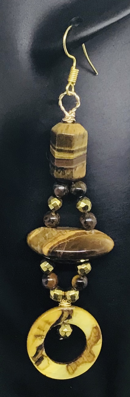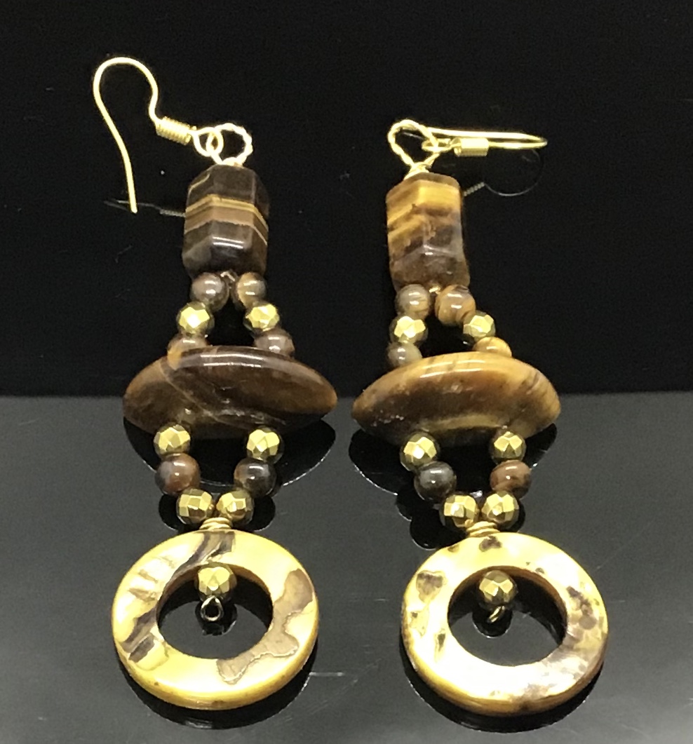 These Handmade Unique Tiger Eye and Hematite Gemstone earrings consist of various shapes and sizes of Tiger Eye w/Hematite. (3 inches), Tarnish Resistant Gold is 99% copper filled covered by sheets of gold in a mechanical bonding process. Tarnish Resistant Gold does not flake off, rub off or turn colors. You can wear it without worry of allergic reaction it is Lead & Nickel free. All Gemstones are natural & ethically sourced.