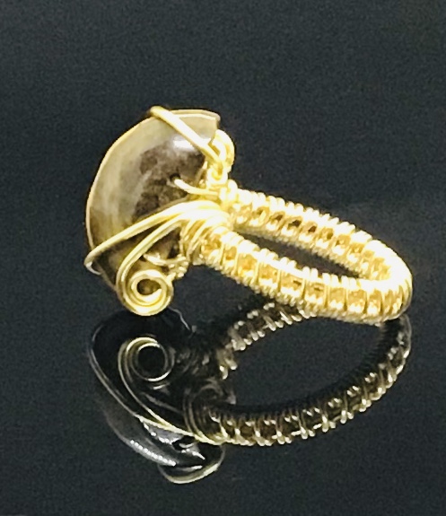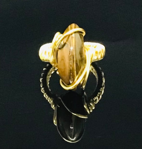 Handmade Wire Weaved Tiger Eye Gemstone Ring, weaved with a Tarnish Resistant Gold, Gemstone is 3/4 inches. All Gemstones are natural & ethically sourced.