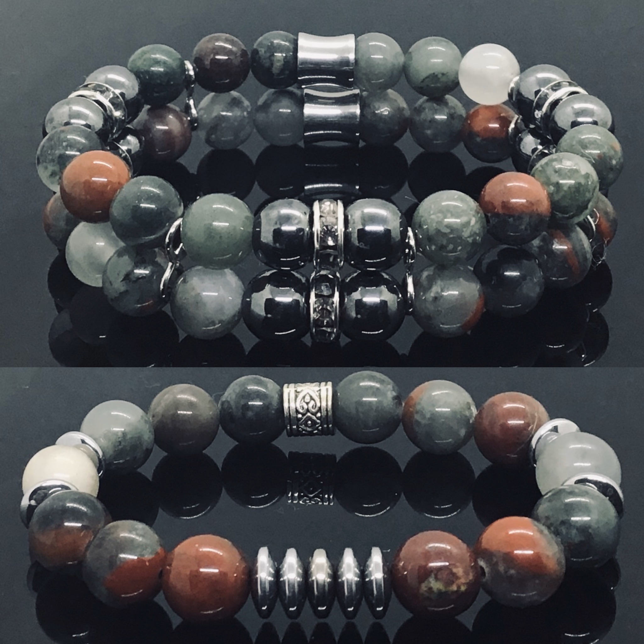 10mm & 8mm Bloodstone Gemstone, & 8mm Silver & Grey Hematite, & Cubic Zirconia Crystals. Heavy duty, Strong, Stretchy, Resilient, & Flexible, Lead & Nickel free, All Gemstones are natural & ethically sourced.