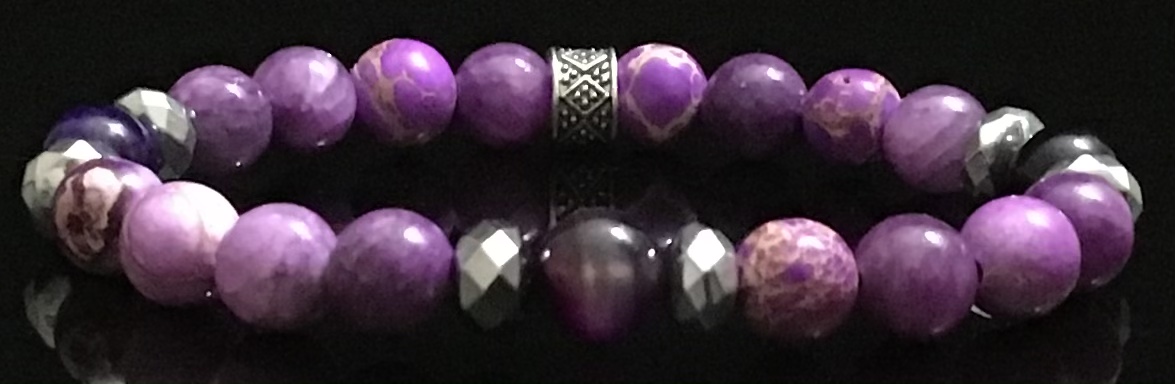 8mm Sugilite Mineral, Sea Sediment Jasper & 3 Amethyst Gemstones; embellished w/Silver Hematite