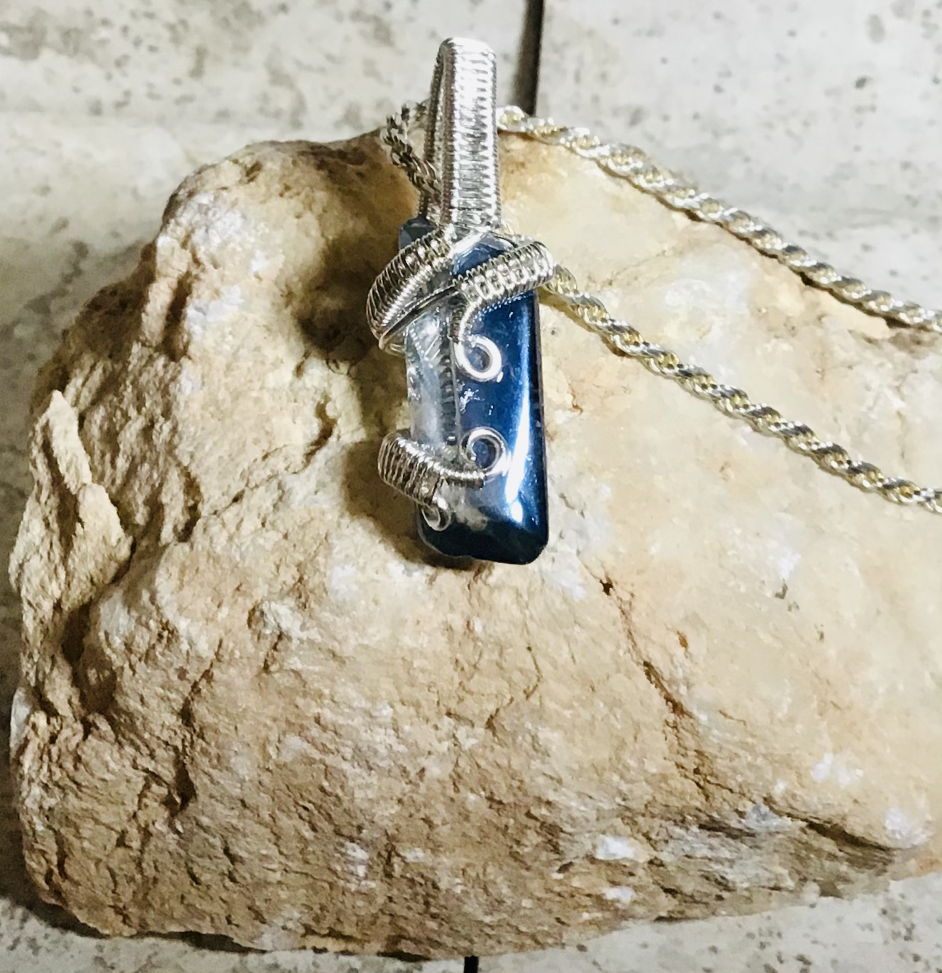 REVERSIBLE 2 SIDES!! Raw Blue Topaz Gemstone intricately handmade weaved, twist and wrapped in TARNISH RESISTANT SILVER! HYPOALLERGENIC! WILL NOT TURN!! (NOT THE CHAIN IN THE PHOTOS) Charm 1 1/2 inches